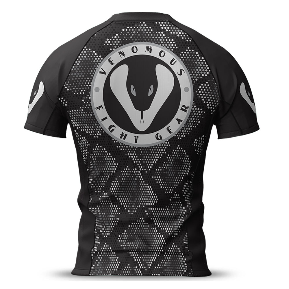 Venomous Black Viper Short Sleeve Rash Guard is specifically designed for Brazilian Jiu Jitsu, Mixed Martial Arts, and other forms of Combat Sports training and has premium features with premium design. Built for fighters who train hard and compete harder. Designed with a bold venom-inspired pattern and premium performance fabric, this rash guard delivers both style and durability inside and outside the cage. The MMA rash guard is short sleeve and made of Polyester/Spandex fabrics, Can be customized with Sublimation or Heat Transfer printing and labeling.
